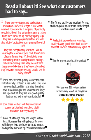 - Length = 34" inside leg - These are designed to be altered with ease should you require a shorter leg length.