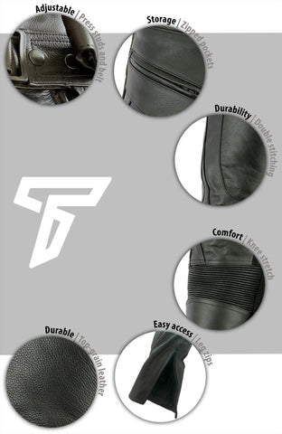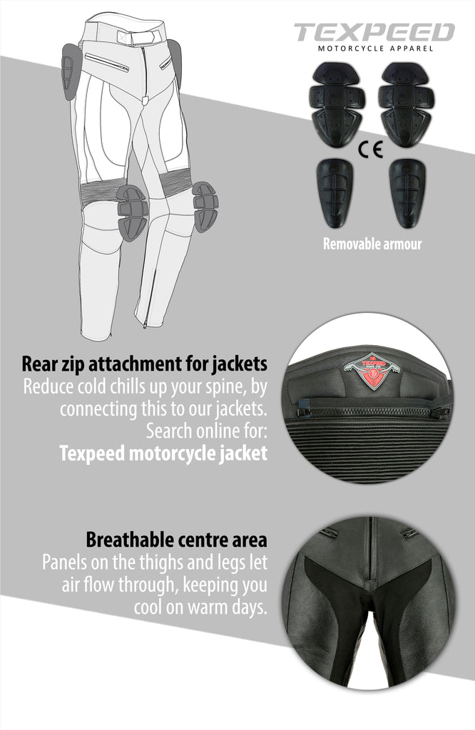 - Belt to waist area to allow adjustment. x2 Front zip pockets & zips to the ankles.