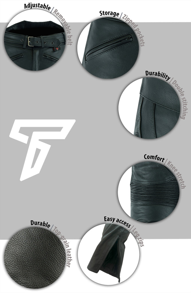 • Stretch leather panels at waist, legs and above the knees - giving the ultimate comfort!