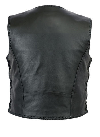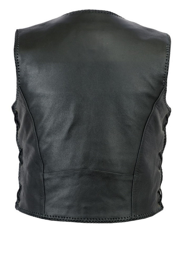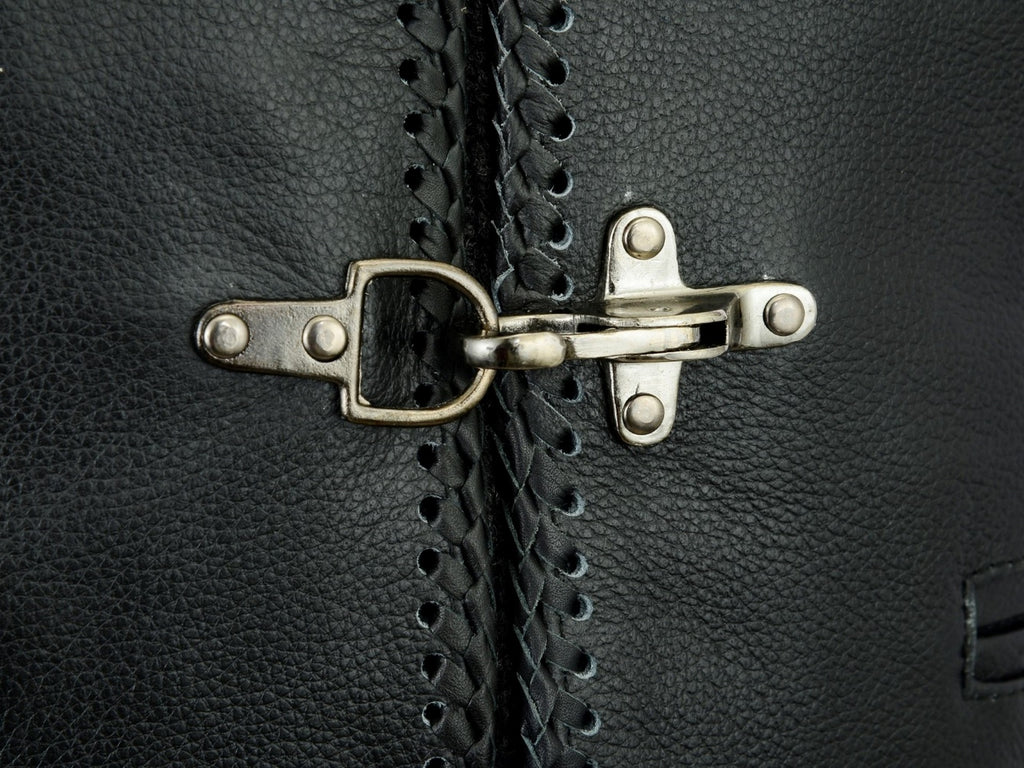 A stylish high quality leather waistcoat with a contrast in design. The spring loaded clips are machine pressed, giving the vest an industrial look while still maintaining a sleeker finish with the woven outlines. The back is purposely simplistic for easy customisation, leaving plenty of space for your favourite badges to be stitched in. Overall this waistcoat ticks all the boxes, well designed, good quality and practical with its three wallet sized pockets.