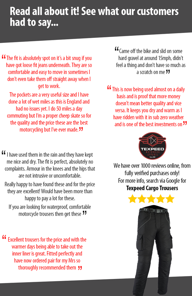 Welcome to our second edition of cargo motorbike trousers, brought to you by Texpeed® an exclusive brand to Bike Wear Direct. After much success with the first edition we’ve introduced this new and improved version with safety, comfort and storage all in mind. We’ve been selling this style of trousers globally for nearly 20 years, during this period we’ve sold over 50,000 pairs across several online platforms. Please click through all our images to take an in-depth view of the trousers, we have several images that fully explain all the important features.
