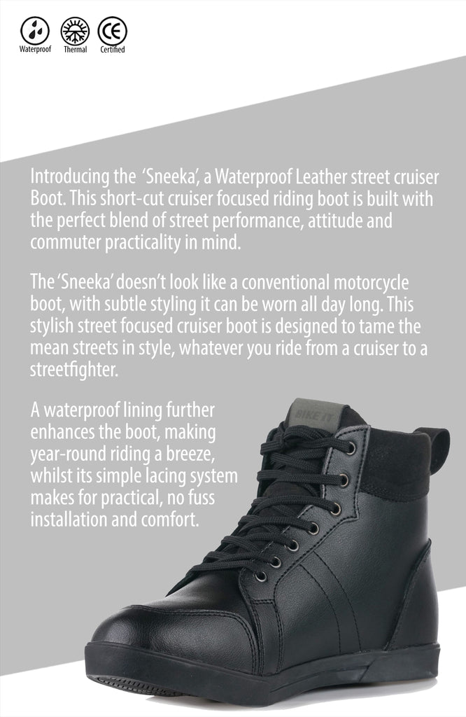 Introducing the Bike It ‘Sneeka’, a Waterproof Leather Street/cruiser Boot. This short-cut cruiser focused riding boot is built with the perfect blend of street performance, attitude and commuter practicality in mind.