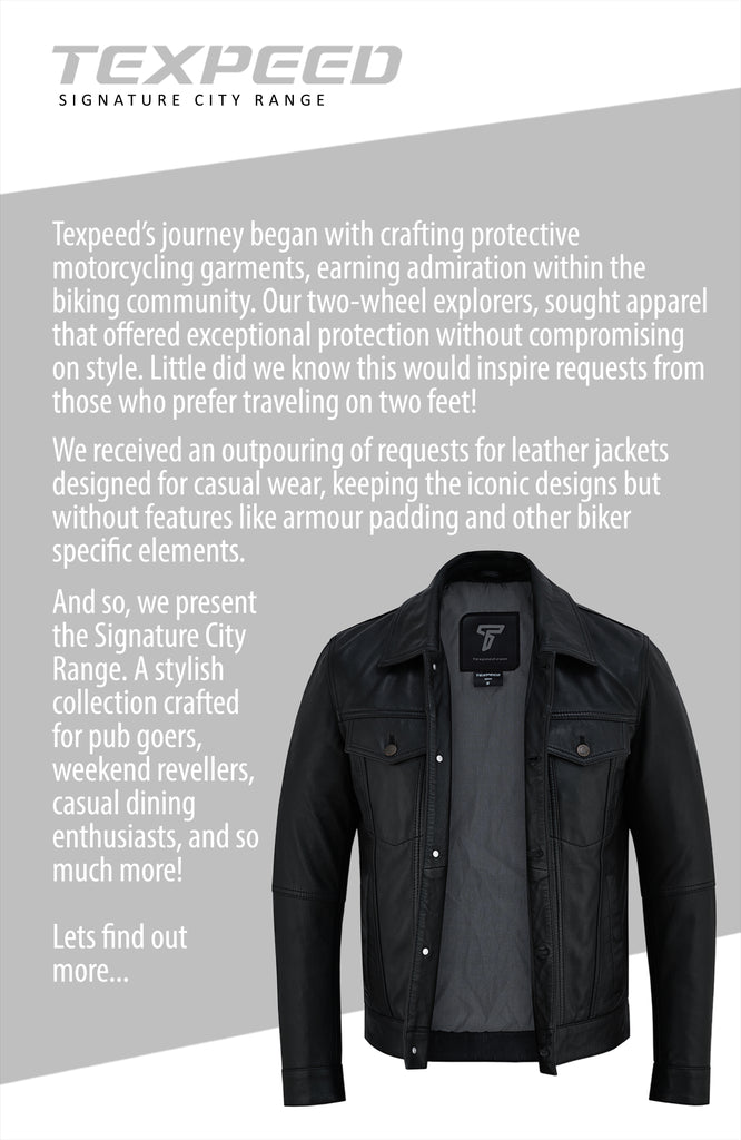So here we have it, welcome to the Signature City Range! A stylish range of garments for the pub goers, weekend revellers, casual dining connoisseurs and so much more. Our range of products are based on the principles of biker style designs, quality components and competitive prices. Please click through all our images to take an in-depth view of our products, we have several images that fully explain all the important features.